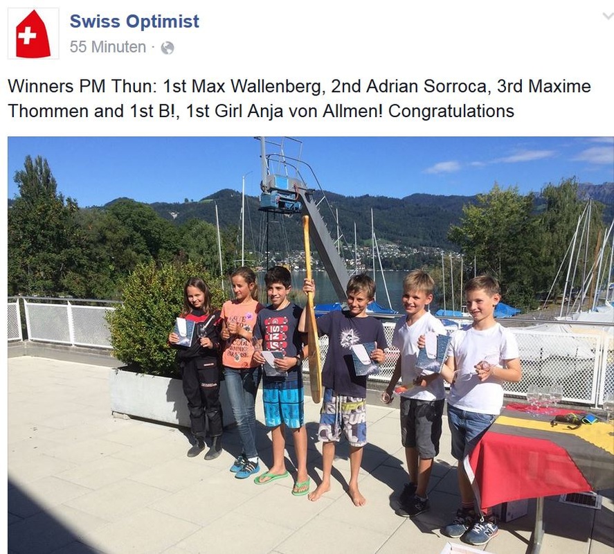 We returned to Lake Thun over the weekend where we had this year’s Swiss Championship to sail a national optimist regatta. We did not have any wind on Saturday but Sunday morning was fine so we could sail two races in actually pretty good wind. I had a good first race with a good start that I could defend quite well, coming in 15th of 49. The second race went less well; I had a poor start but managed to overtake around 20 boats becoming 20th. I ended up in 31th place overall, my second best ranking ever at a national regatta. I was lucky enough to again be called to the podium, this time as third opti “B” (my age group).