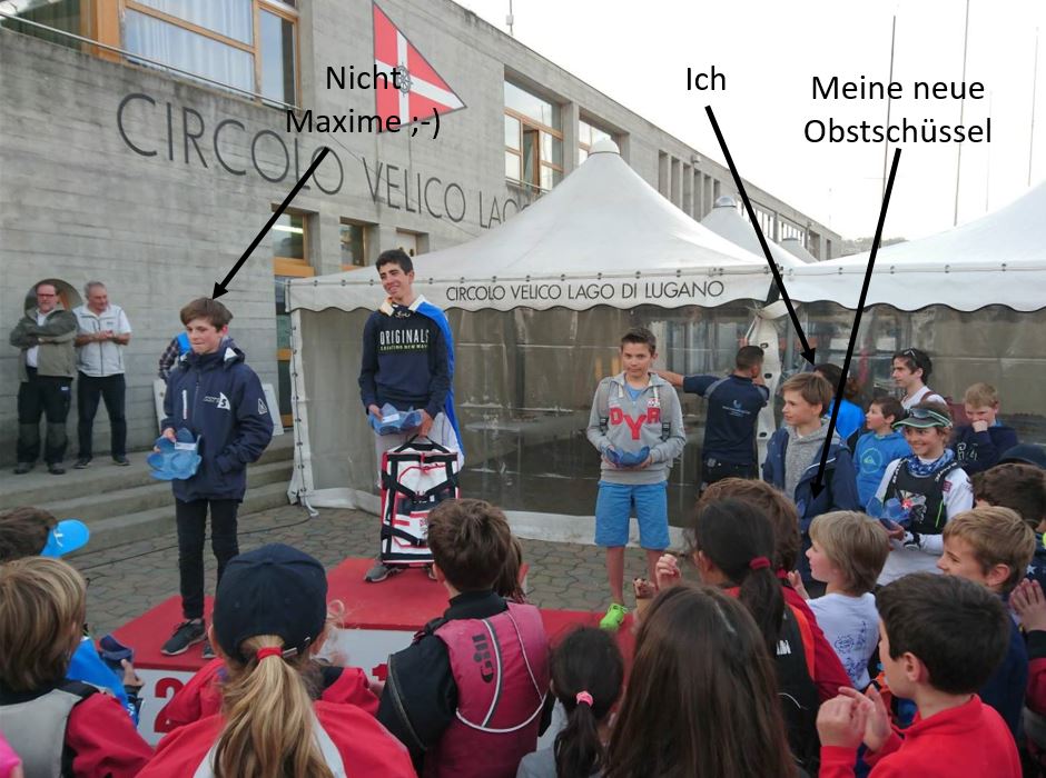 Wir mussten sehr lange auf den Wind warten. Trotzdem gingen wir raus. Weil es keinen Wind hatte und es schon spät war, fingen die Trainer schon an, uns in den Hafen zu schleppen. Kurz vor der letzten Startmöglichkeit schien trotzdem Wind zu kommen. Und wir machten einne Lauf ich wurde neunter. Insgesamt bin ich vierter geworden und habe eine tolle Obstschüssel bekommen über die sich vor allem mein Vater gefreut hat – weil ich so viel Obst esse ;-).